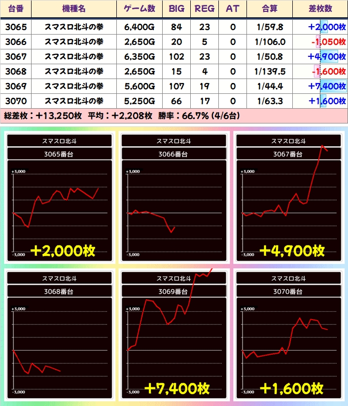 大本命機種「スマスロ北斗」には+7400枚を筆頭に6台中3台が+2000枚以上で平均+2208枚の素晴らしい並び! +5800枚などの優秀な単品がありました。