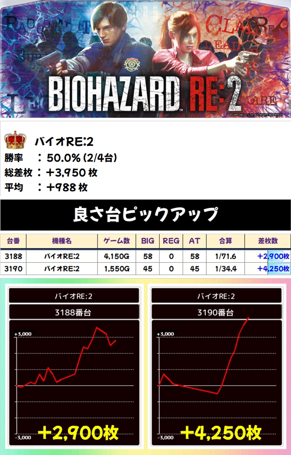「バイオRE:2」「新ハナビ」も1/2系に! バイオRE:2の対象台から+4250枚、+2900枚の大爆発!
