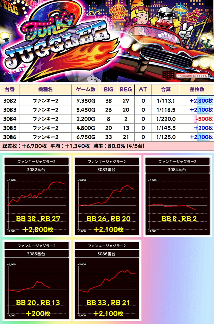 「アイム」には+1000枚以上を4台含む5台並び、「ファンキー2」には+2000枚以上を3台含む5台並びがありました!
