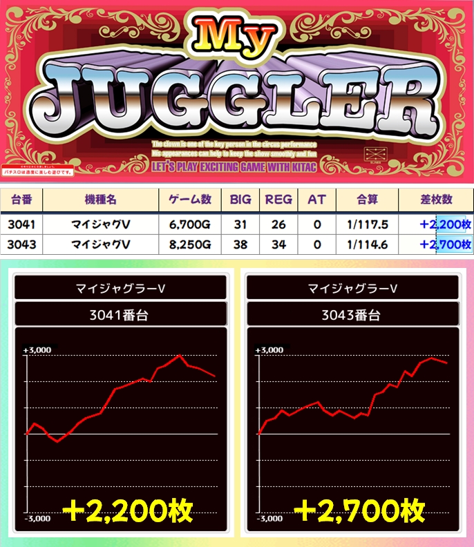 「マイV」にもボーナス合算が設定⑥の近似値で+2000枚以上の優秀台が2台! ジャグも相変わらず強いですね~!