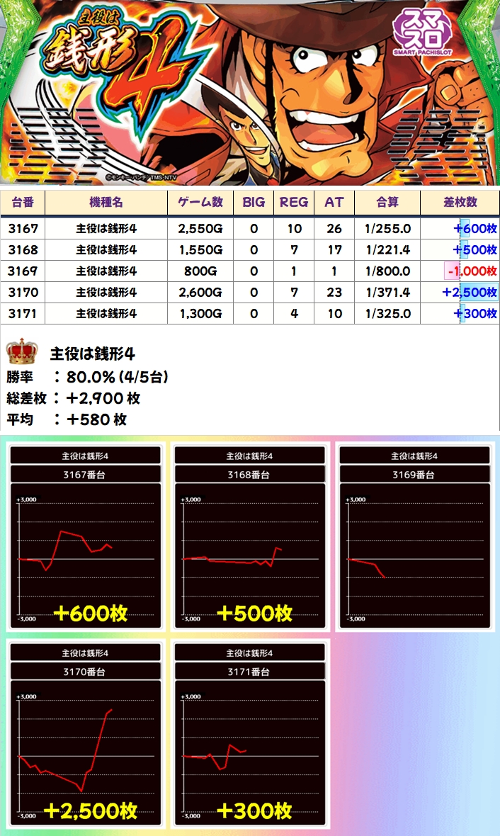 【全台系】主役は銭形4(5台):平均+580枚