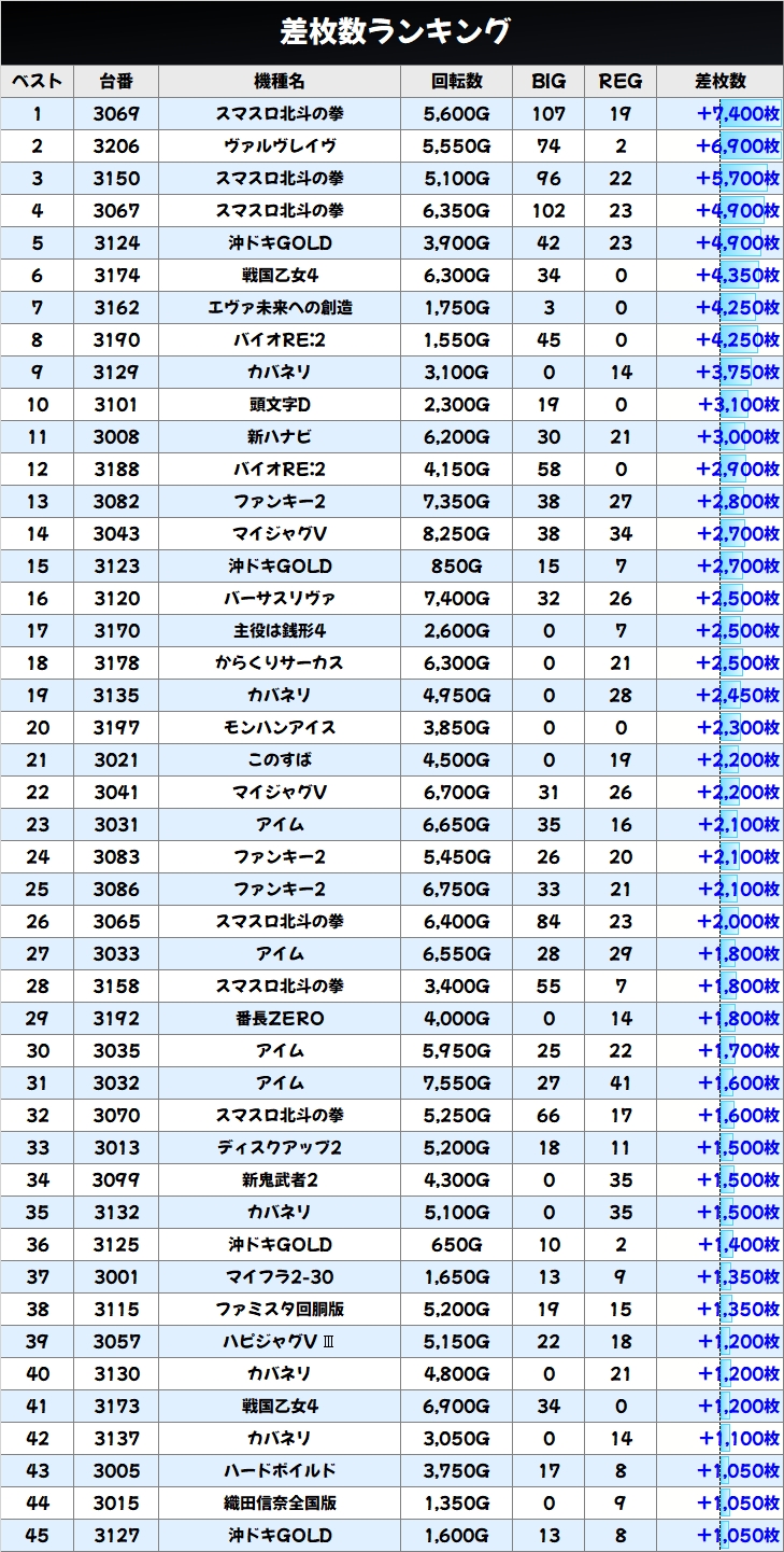 ちなみに前回調査した日曜日は平均差枚+116枚、総差枚+24750枚と結果を残しています!