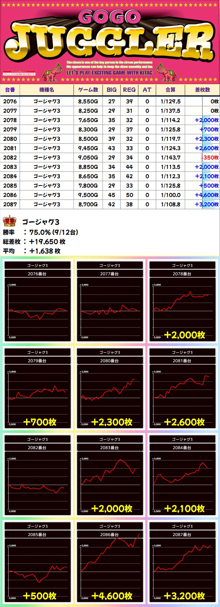 【全台系濃厚】ゴージャグ3(12台):平均+1638枚
