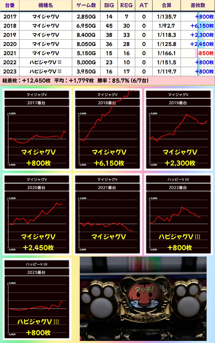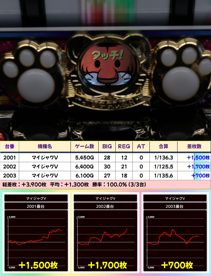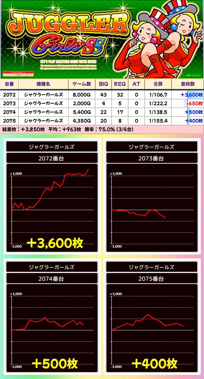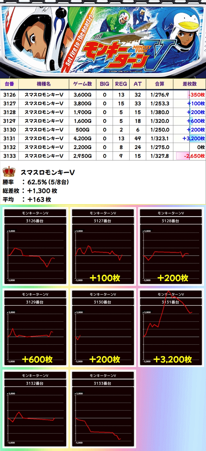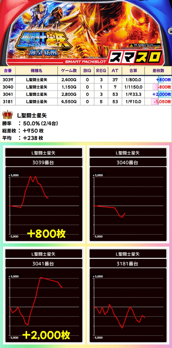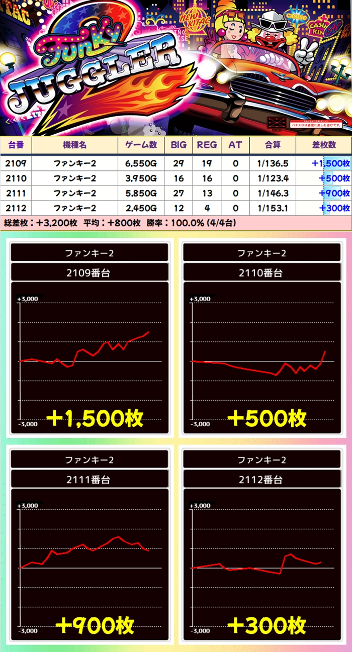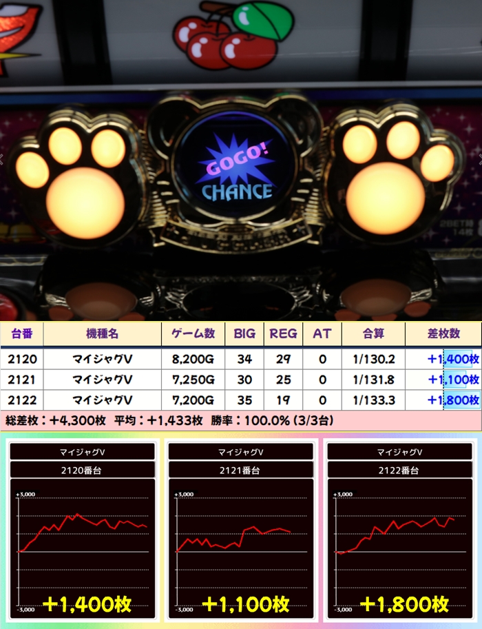 当日から増台し稼働を開始したG1も優秀で1台は+5200枚超を獲得!期待できる日に入れ替えや増台があった場合は対象機種も狙い目ですね。