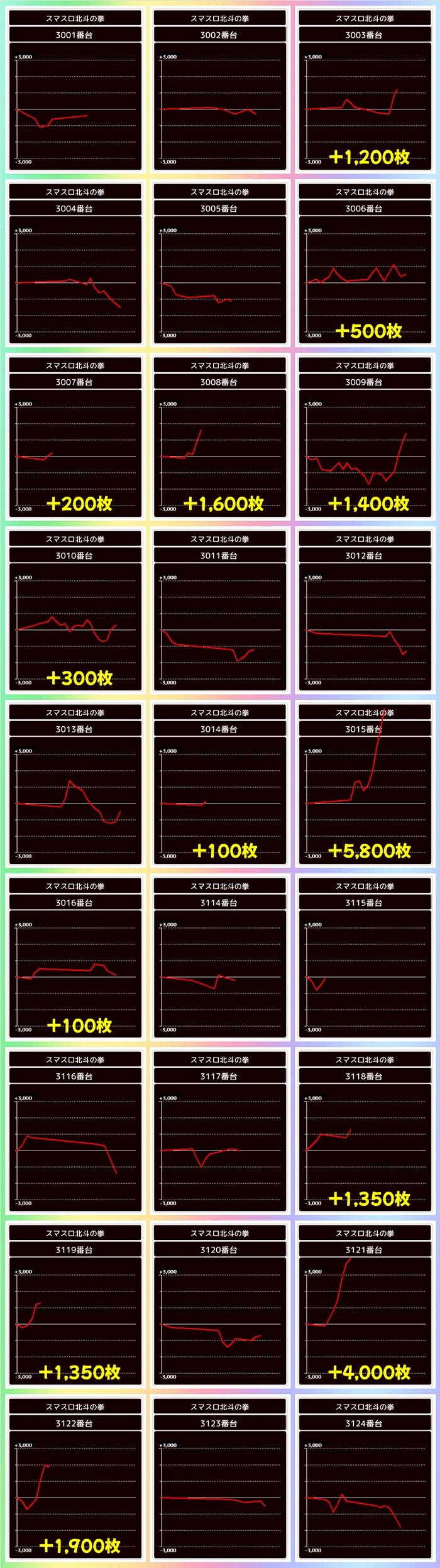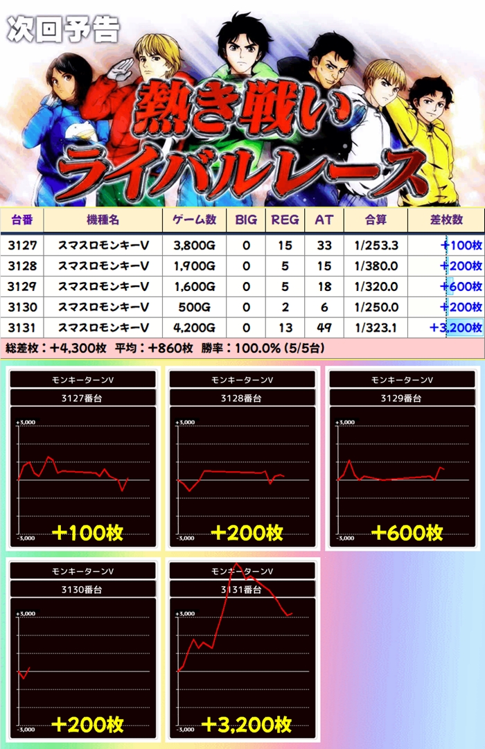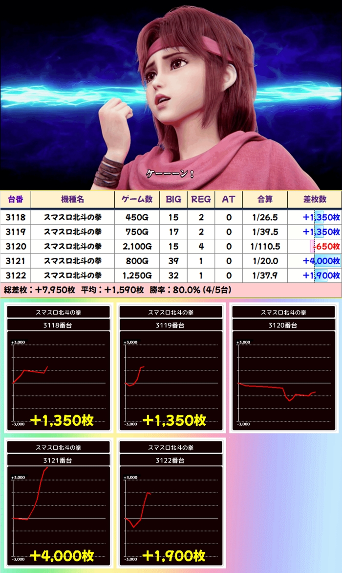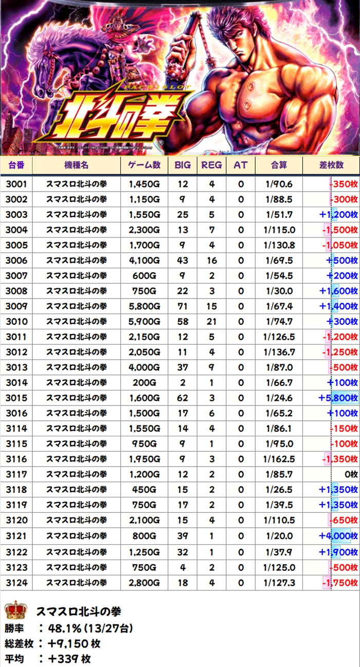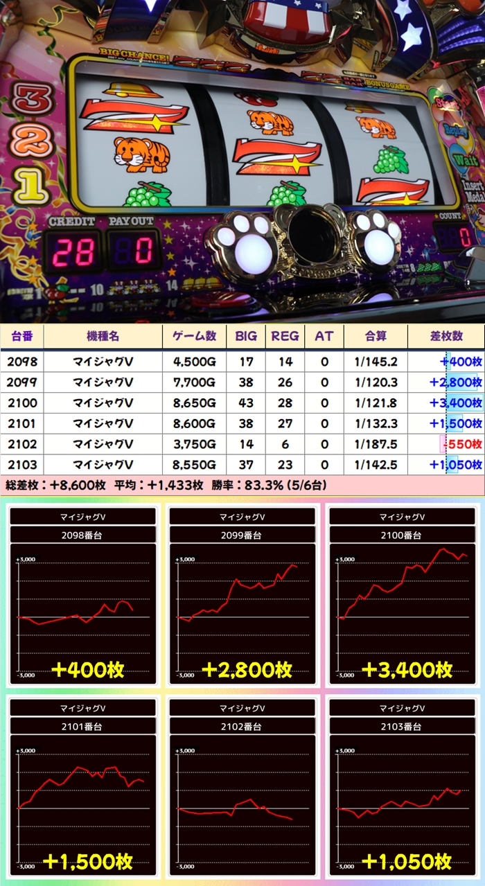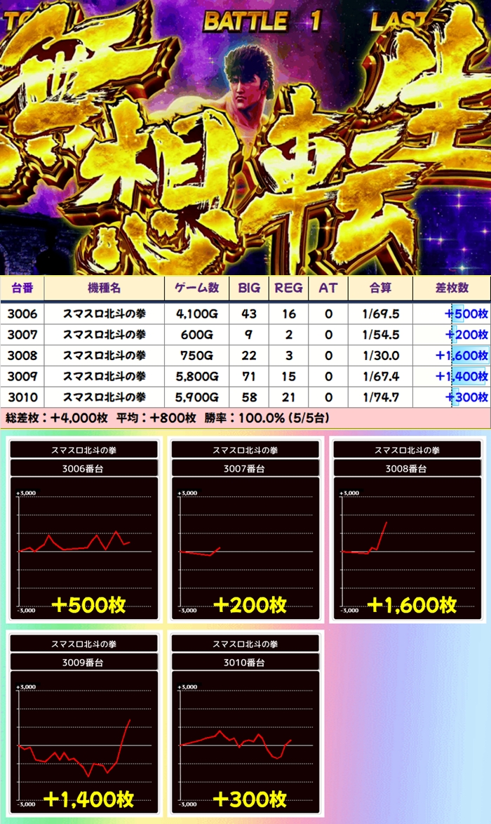 当日から増台し稼働を開始したG1も優秀で1台は+5200枚超を獲得!期待できる日に入れ替えや増台があった場合は対象機種も狙い目ですね。