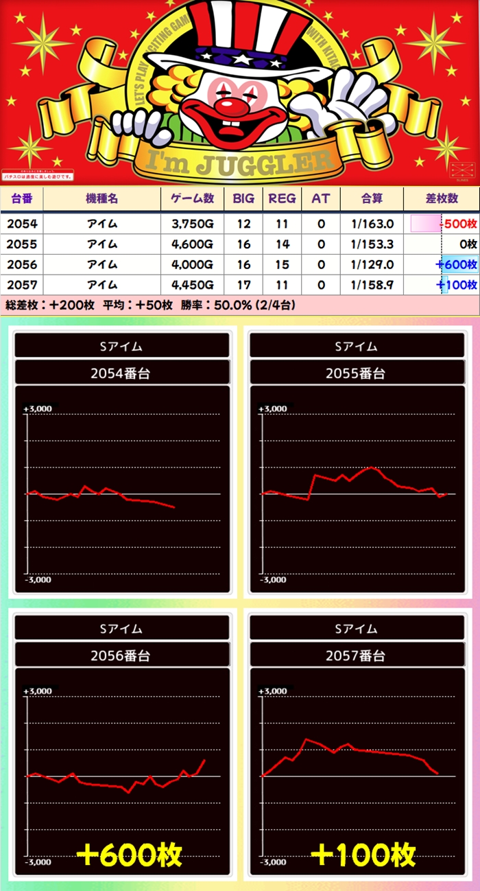 全台プラスとまではいかないものの各並びの大半がプラス差枚で、+2000枚超の大量獲得台も複数ありました。ジャグは稼働からもお宝台だと察していたと思われますが、AT機などから稼働不足気味の台が複数あったのがもったいないですね。次回期待できる日は周囲の状況を見て、状況が良ければもっと粘ってみても良いと思います。