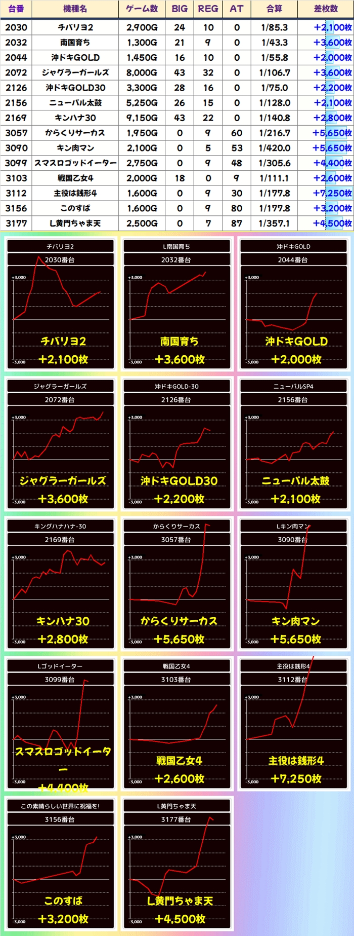 ジャグ以外のノーマルや少台数スマスロからも単品優秀台を複数確認。最新機種の黄門ちゃま天や沖スロ系の機種にもお宝台がしっかり使われていたように感じました。