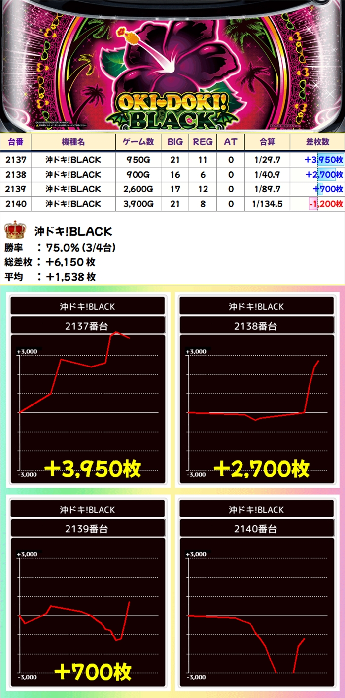 【全台系濃厚】沖ドキBLACK(4台):平均+1538枚