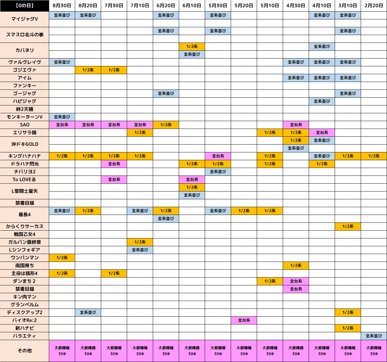 0のつく日は、ハナハナ系などの30パイ、大都機種が特に強い傾向があります。