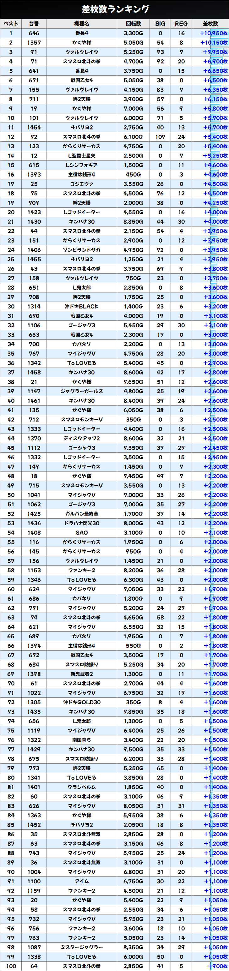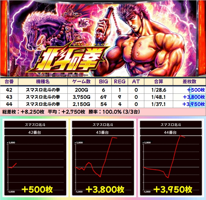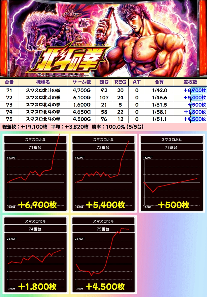 前述した通り並びが2か所あった「スマスロ北斗」は+6900枚を筆頭に計5台が+3000枚を突破!
