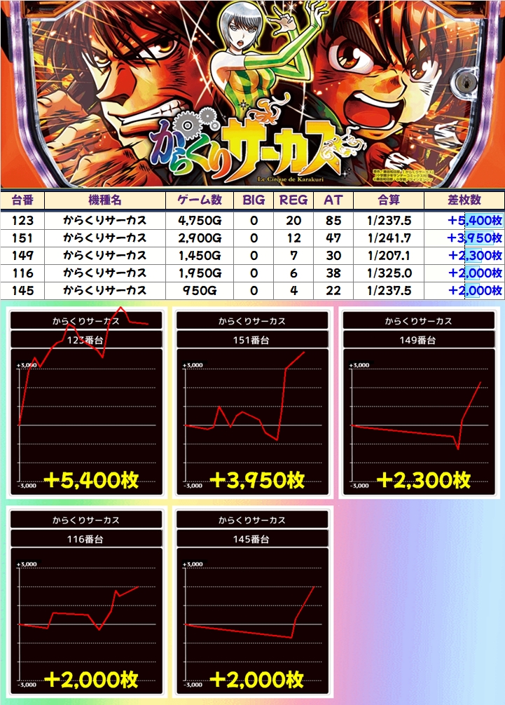 「からくりサーカス」も+5400枚を筆頭に計5台が+2000枚を突破!
