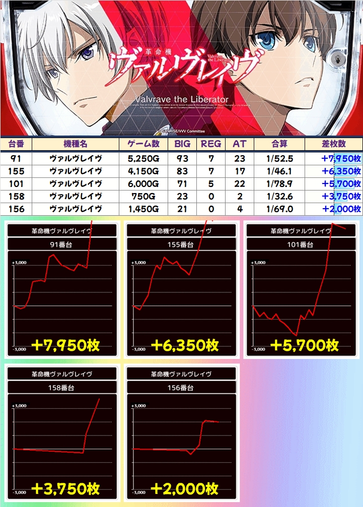 日々、爆裂台を輩出している「ヴァルヴレイヴ」。この日も+8000枚、+6000枚超、+5000枚超と抜群の台が続々!