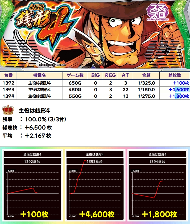 ポスト機種以外に「主役は銭形4」が全台系濃厚に! +4600枚を筆頭に全台プラスで平均+2167枚を達成!