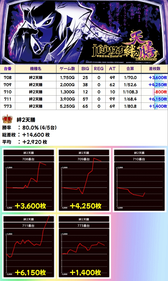 前述したポスト機種「バジ絆2天膳」。速報後にしっかり出玉が増加し、+6150枚を筆頭に5台中3台が+3000枚オーバーを達成!