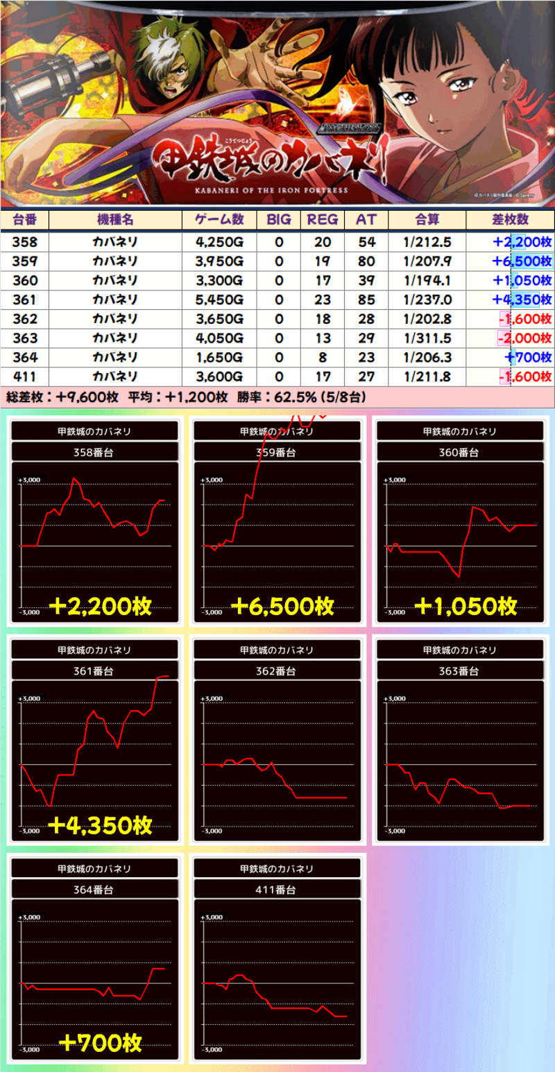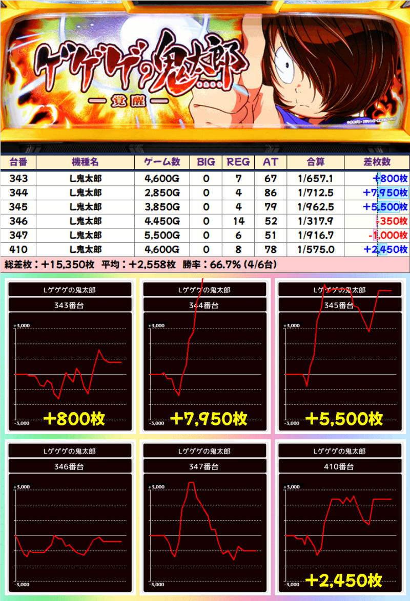 L鬼太郎からは+7950枚、カバネリからは+6500枚、L炎炎ノ消防隊からは+6200枚と、+6000枚以上の差枚獲得台も数多くありました!