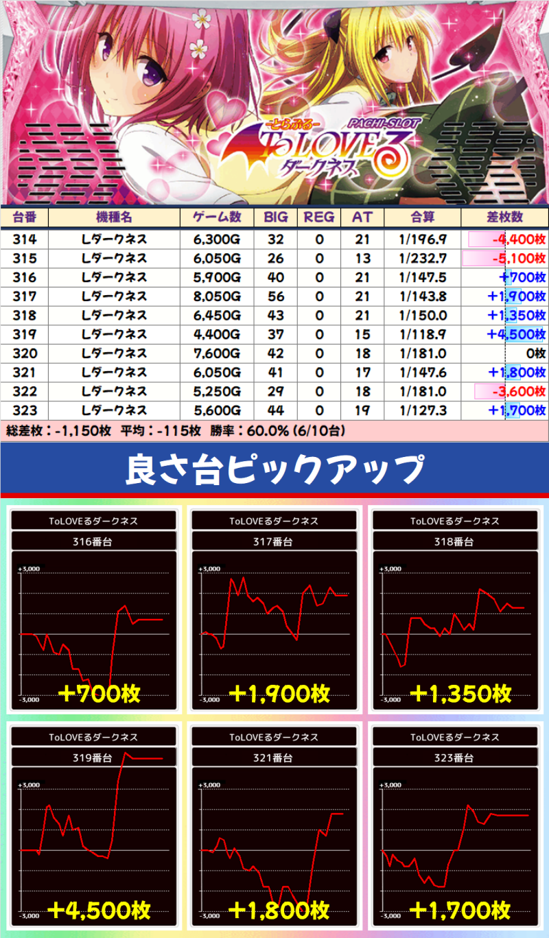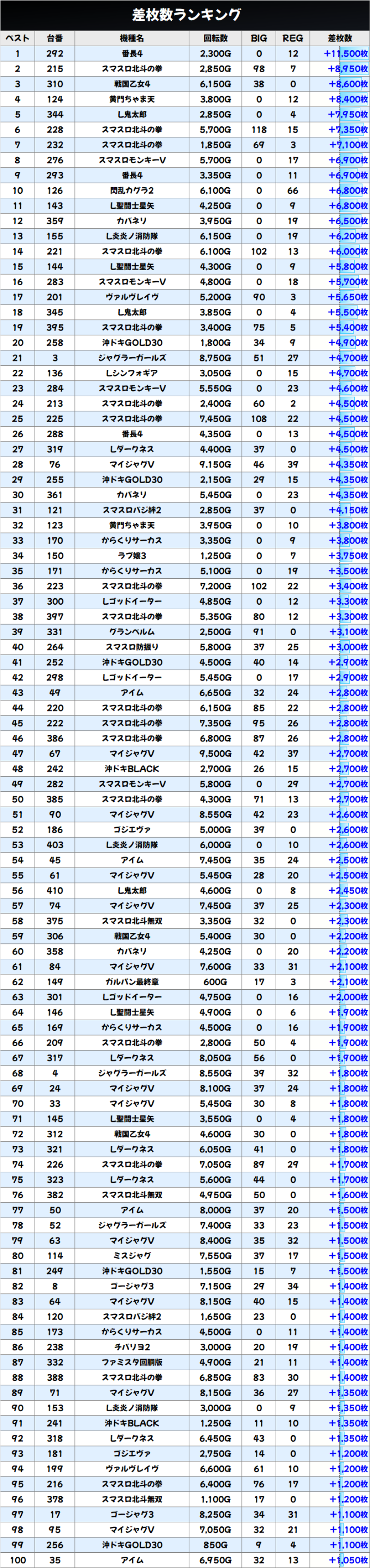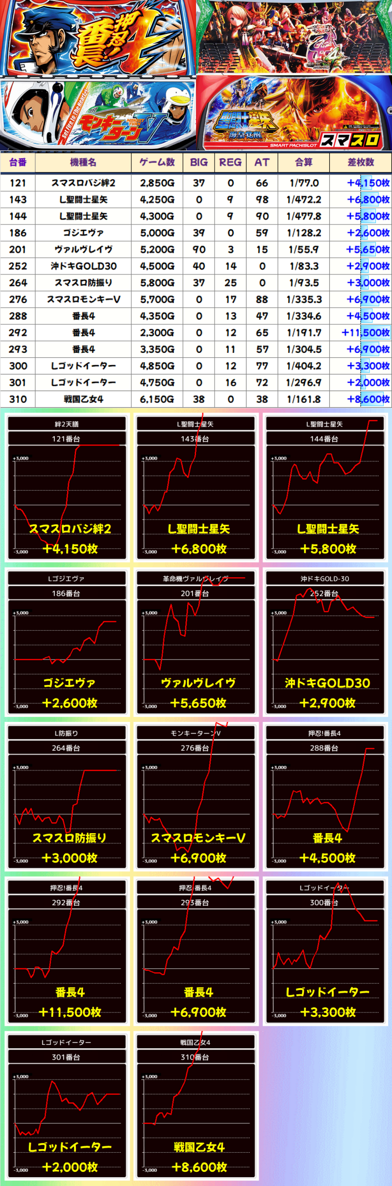 9台並びは平均+3200枚の差枚。5台並びは平均+1350枚の差枚。その他単品には、+8950枚、+7100枚という差枚を獲得した台がありました!