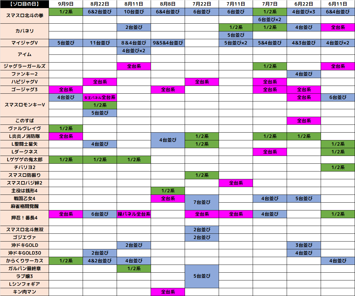 エスパス溝の口本館のゾロ目の日は、多台数機種に全台系、その他大量に4台以上の並びが出現する1日。過去の仕掛けを見ると、10台以上の全台系機種や、北斗・ジャグラーを中心とした4台以上並びが出現しています。