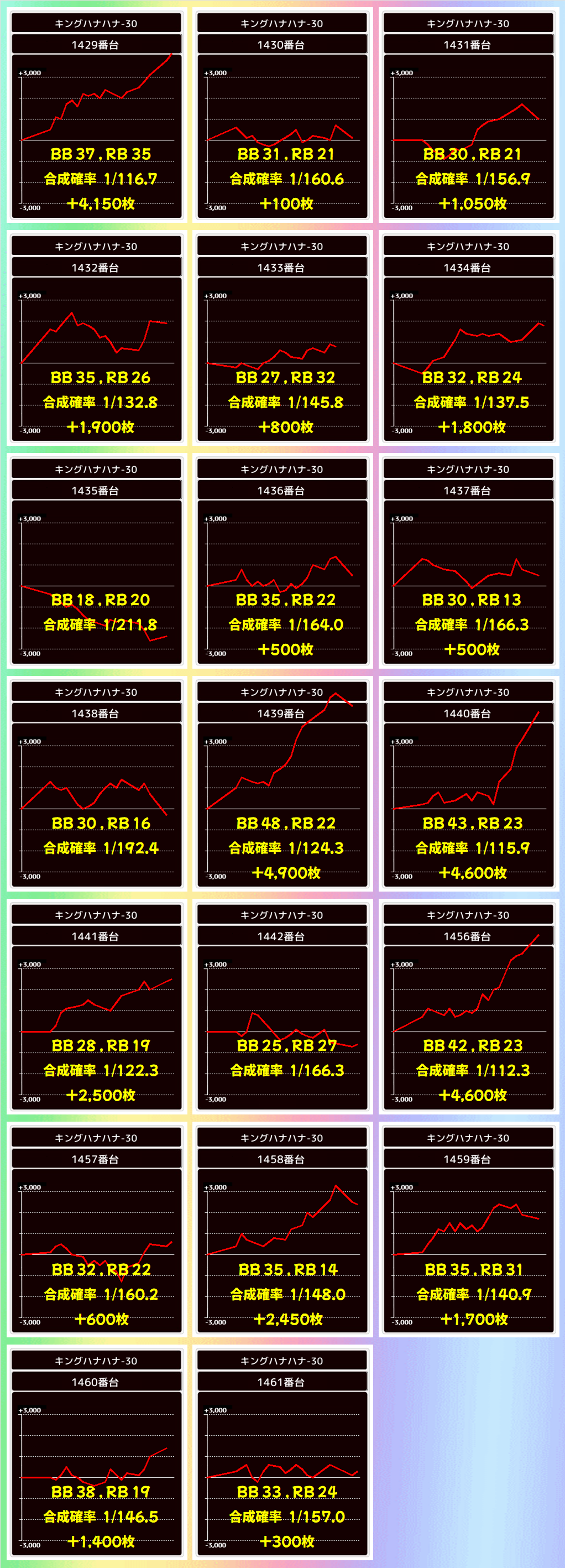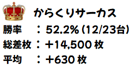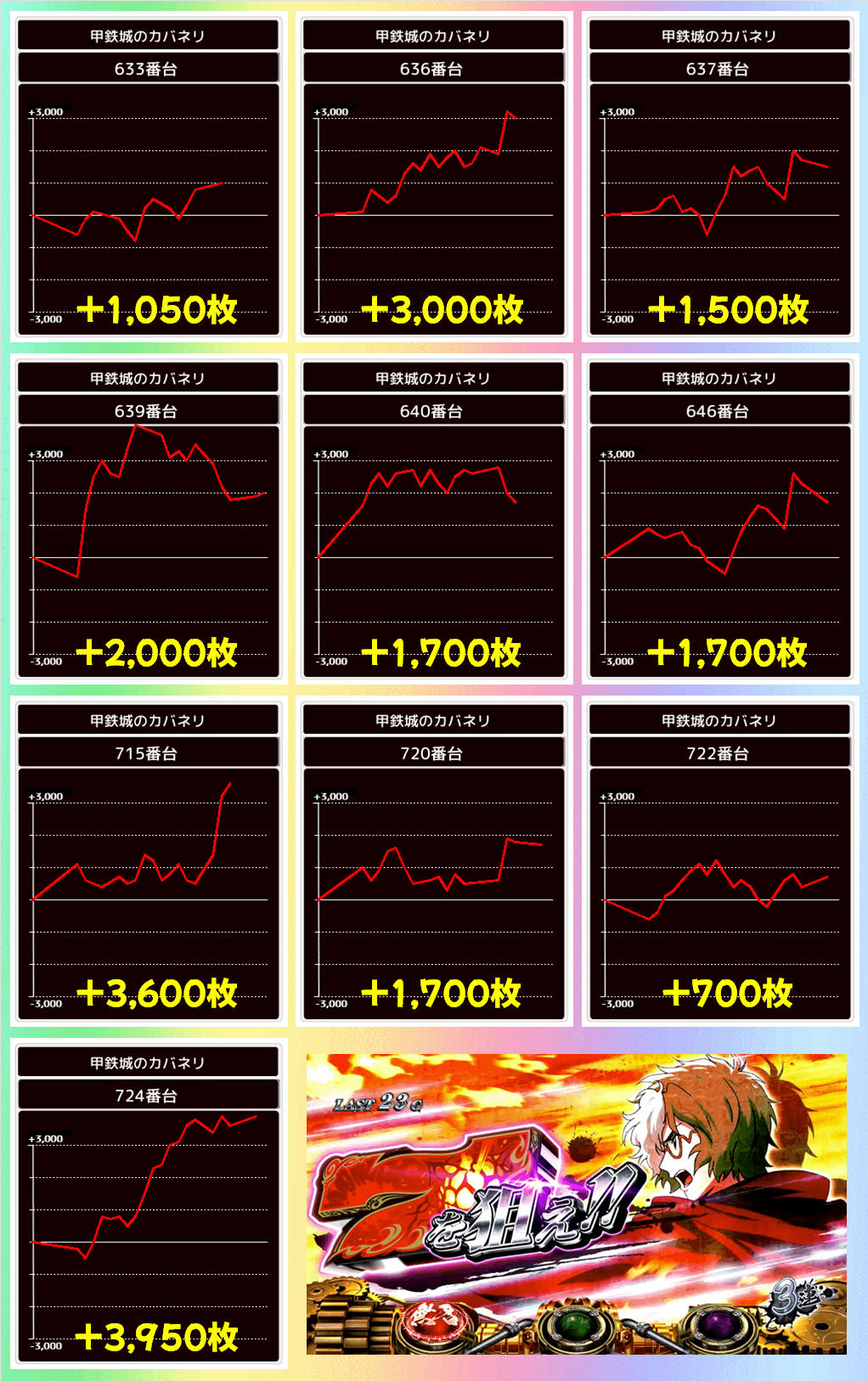 冒頭で紹介しましたが本日は総差枚+131950枚、平均差枚+205枚の好成績。万枚オーバーが3台ありましたがそれだけでは出せない数字なので、いかに高品質の仕掛けや単品が多かったかが成績からもわかりますね。