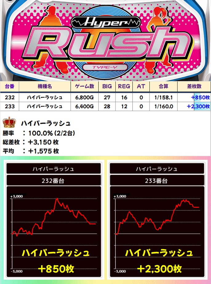 続いては新台のハイパーラッシュ!こちらもしっかりと打ち込まれていましたね!2台ともプラスの平均+1575枚と申し分なしの全台系でした!