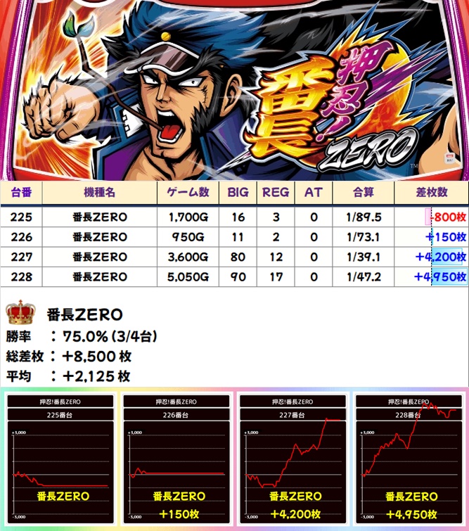 🌈番長ZERO(4台)【平均+2125枚】