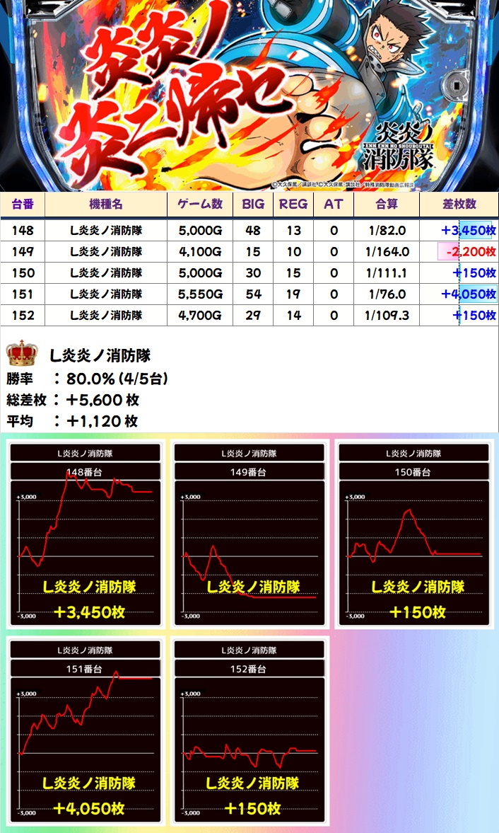 L炎炎ノ消防隊からも4/5でプラス&平均+1120枚に!今更ですが、第8消防隊だから8繋がりで仕掛け対象になりやすいかも!?今後も注目!
