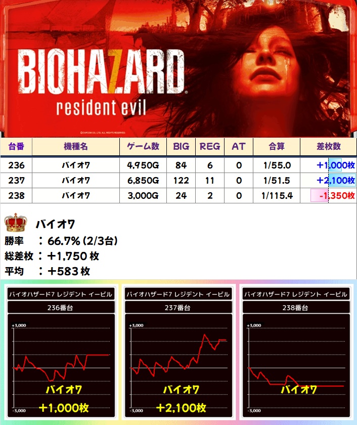 そして仕掛け機種の常連になりつつあるバイオRE2。全台プラスの平均+1867枚と全台系で間違いなしでした!