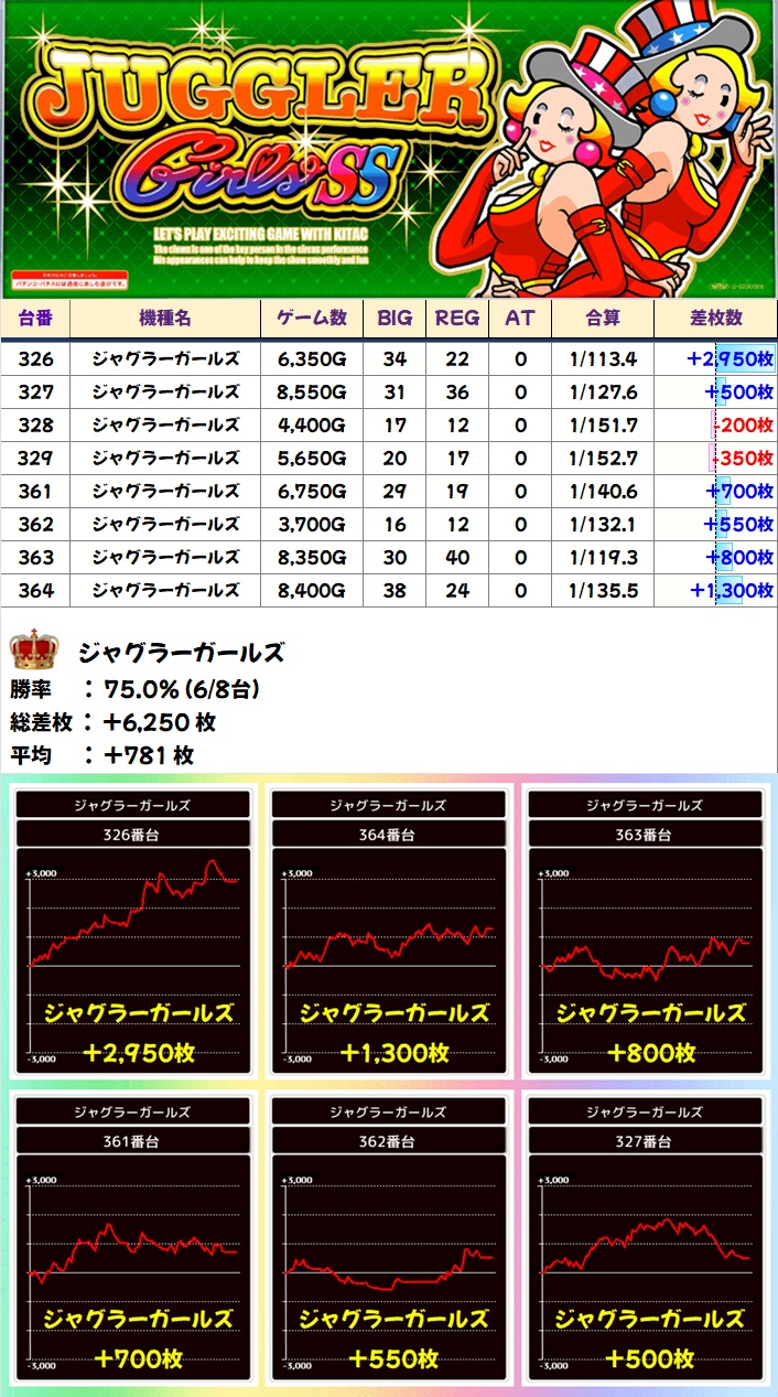 🌈ジャグラーガールズ(8台)【平均+781枚】