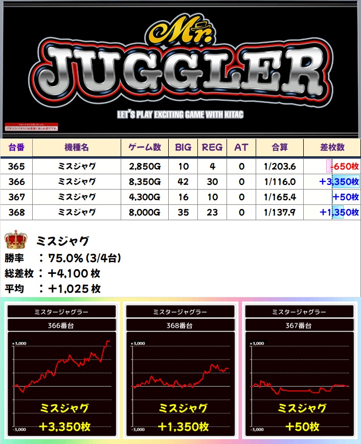 🌈ミスタージャグラー(4台)【平均+1025枚】