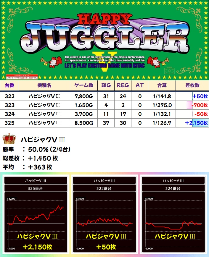 🌈ハピジャグVⅢ(4台)【平均+363枚】