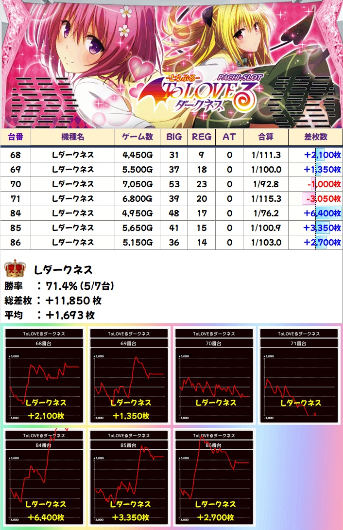 まずはLダークネス!5/7でプラスと2台マイナスとなってしまったものの、平均は+1693枚と好結果に!全台打ち込みが完璧だっただけに示唆系が出ていた!?
