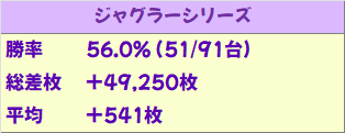 安定のジャグはいつも通りの高配分で、ジャグは勝率51/91の平均+541枚と今回もしっかりと好結果に!