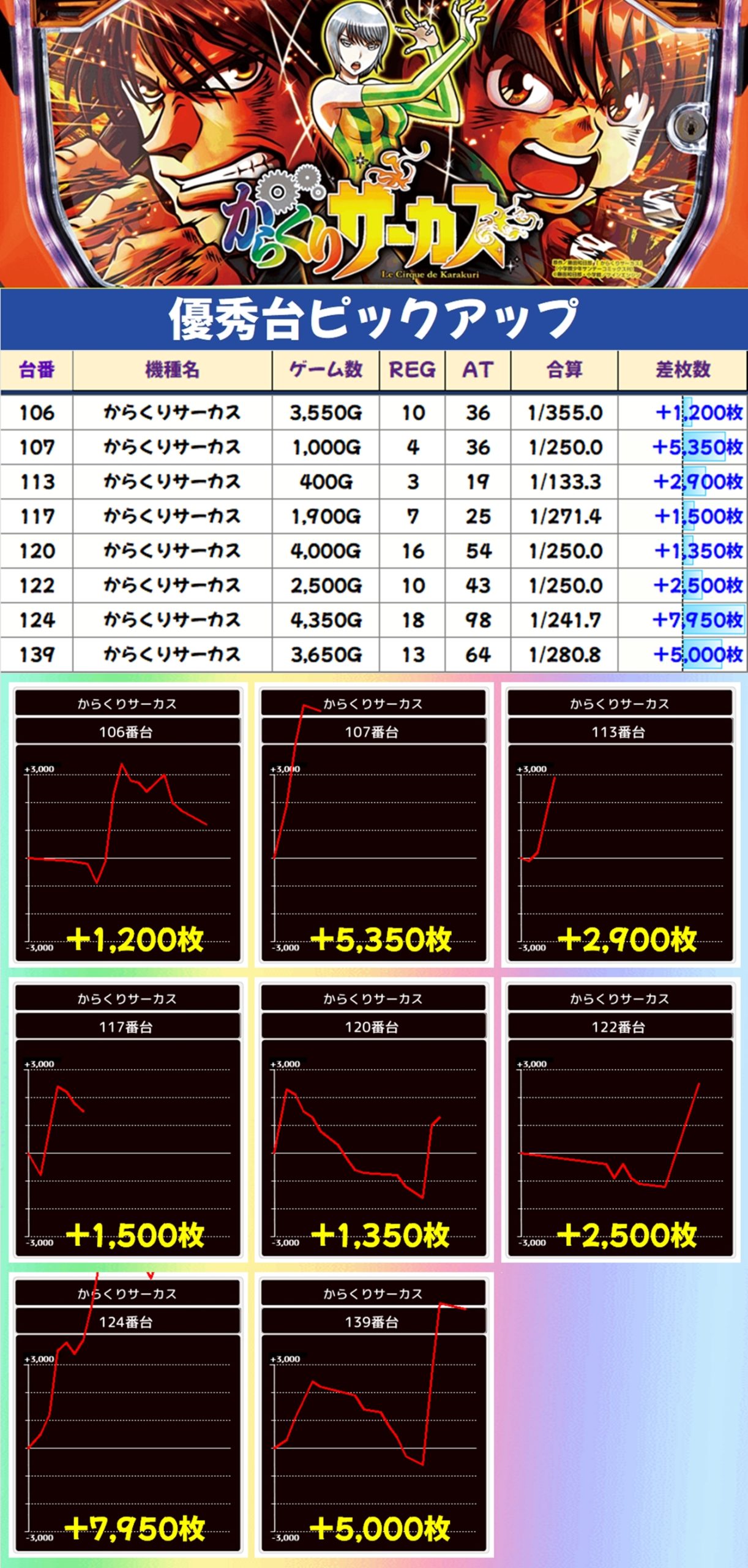 からくりサーカスからは+7,950枚を筆頭に大量出玉が多数出現!