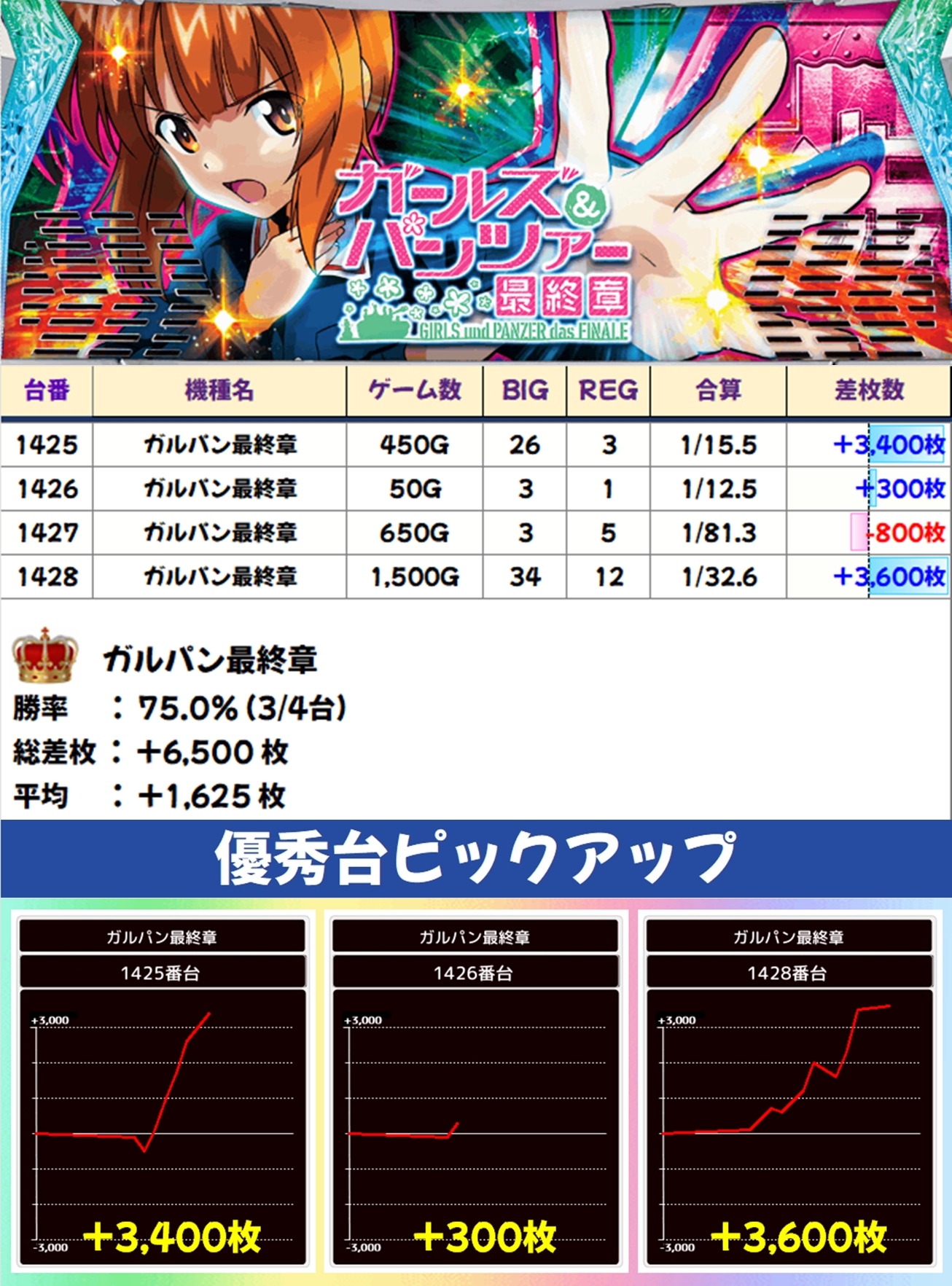 4台設置のガルパン最終章も1/2系濃厚で3台がプラスに。+3,600枚と+3,400枚の大量出玉を確認できました!