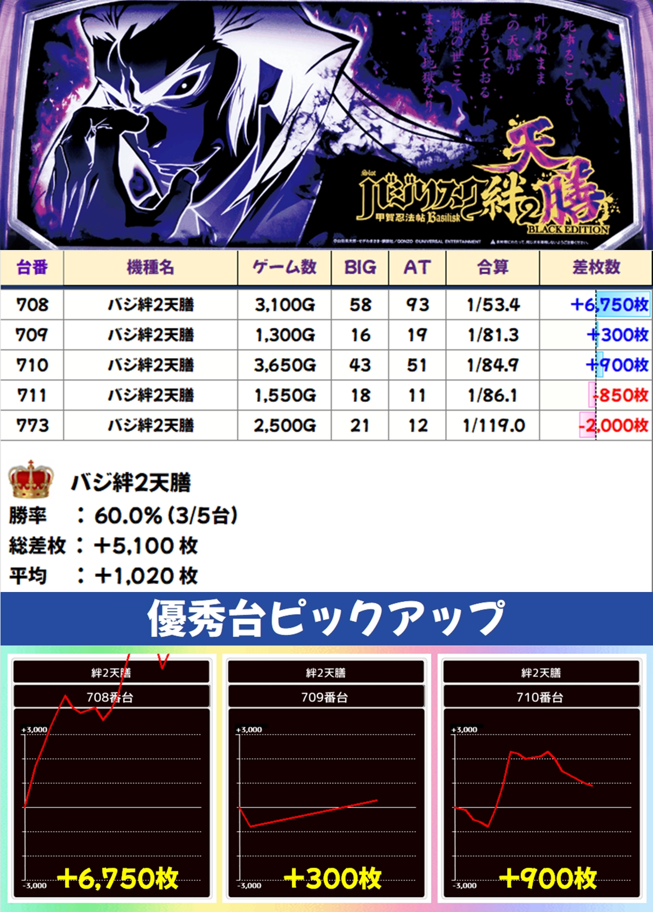 バジ絆2天膳は5台中3台がプラスとなり、+6,750枚の優秀な出玉が出現。平均で+1,000枚超の結果となりました!