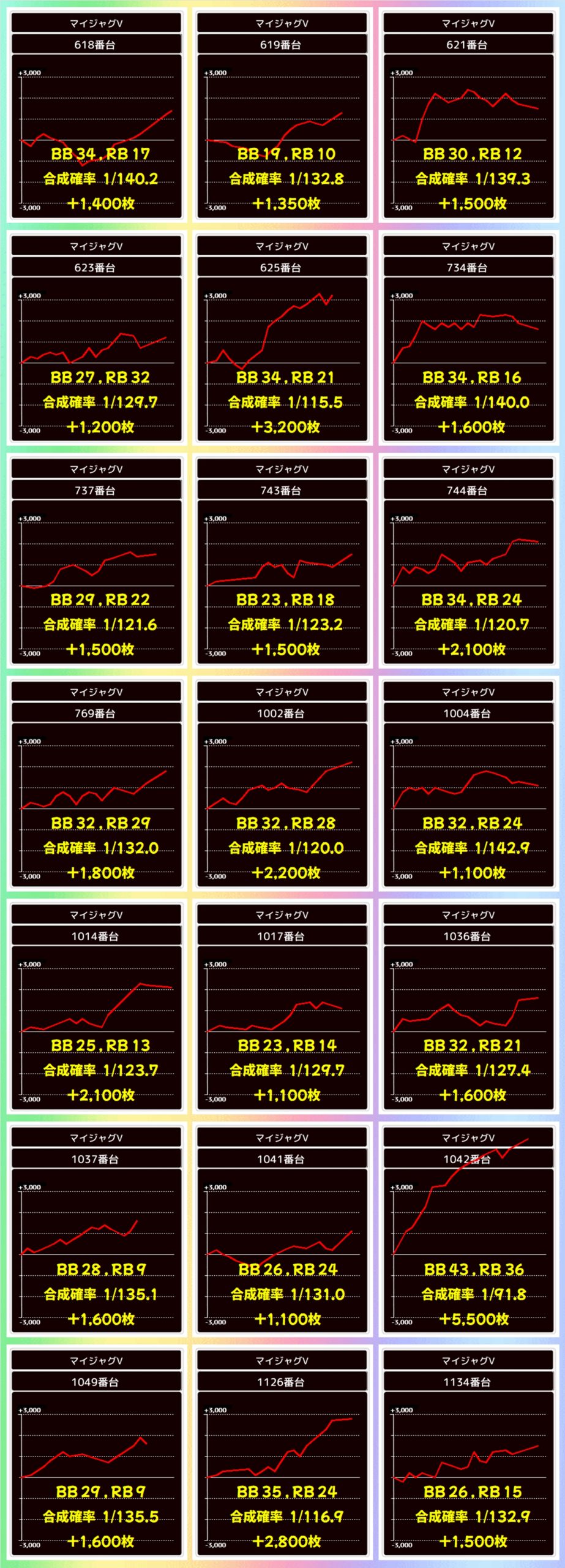 マイジャグVからは、+5,500枚の大量出玉を確認。その他にも+3,200枚や+2,800枚など優秀な出玉を多数確認できました!