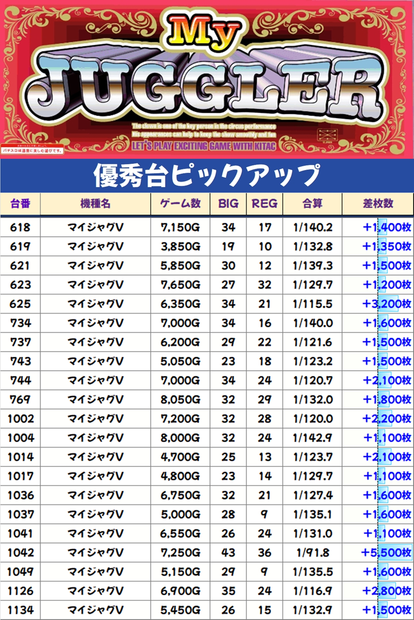 各機種の優秀台をピックアップ! まずはマイジャグVからチェックしてみましょう。
