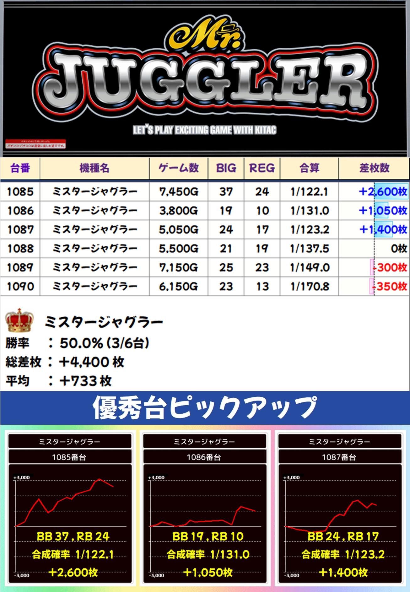 6台設置のミスタージャグラーも結果やボーナス出現率を見るに、1/2系濃厚。こちらは平均で+733枚となりました。