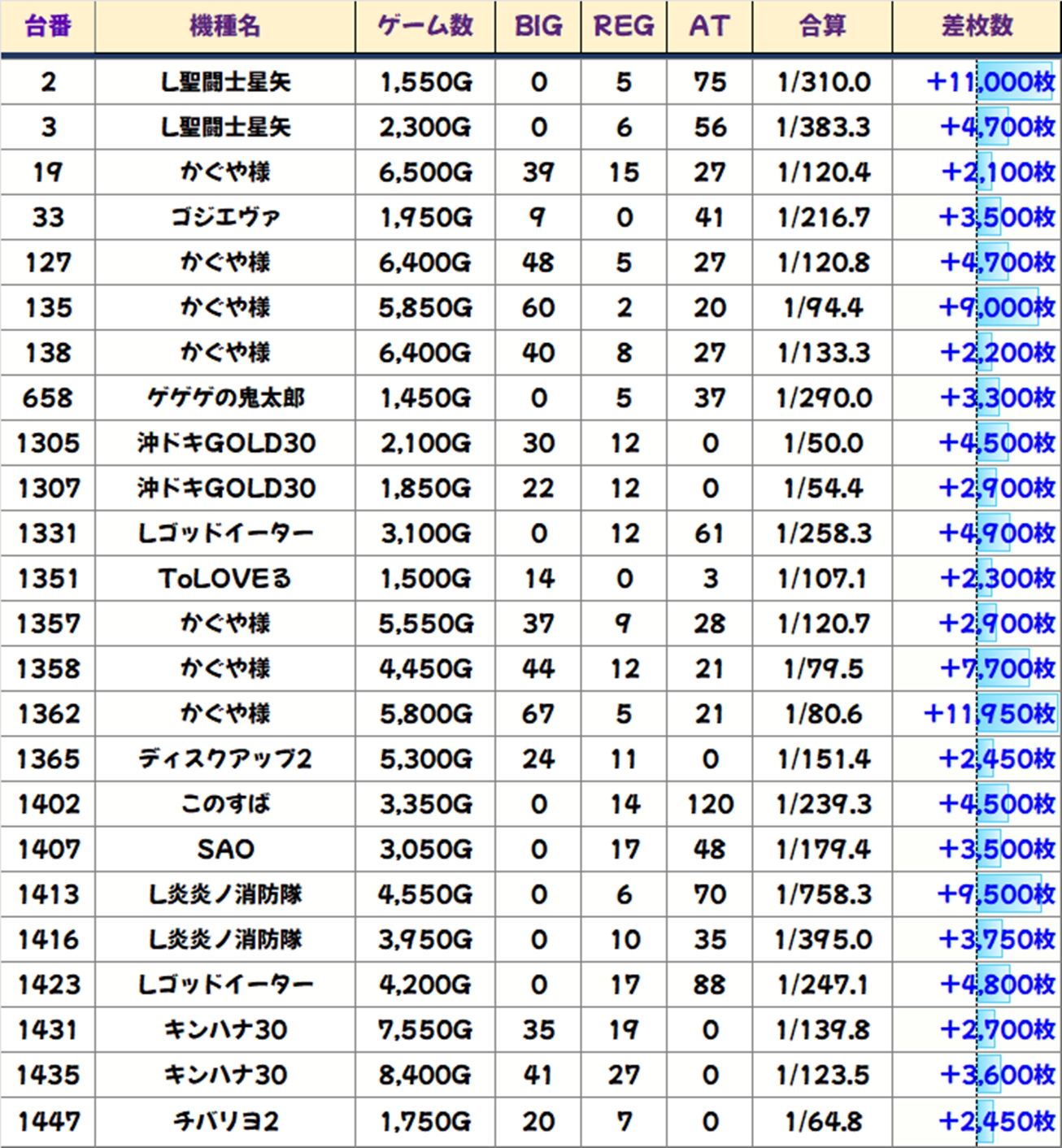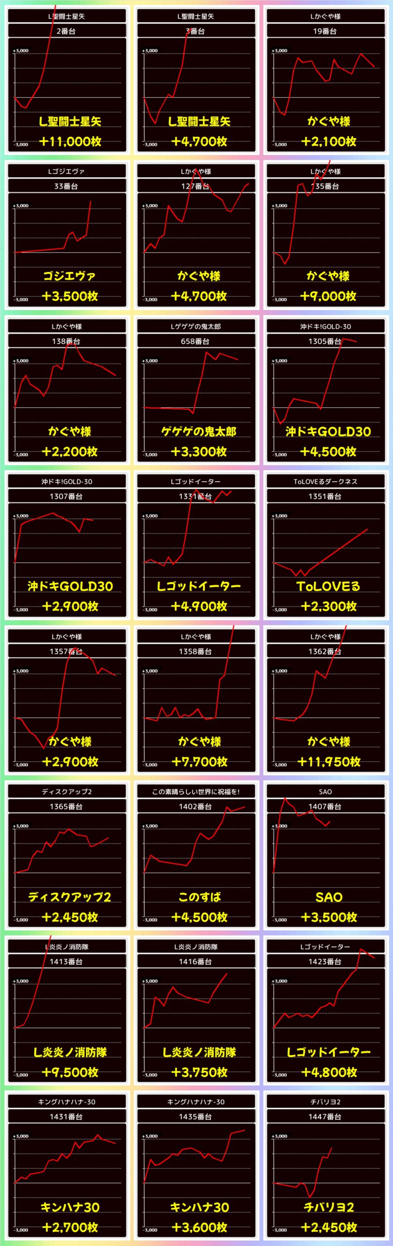 紹介してきた仕掛けに加えて、単品の優秀台も多数確認。L聖闘士星矢からは+11,000枚、かぐや様から+11,950枚などの万枚オーバーも出現し、L炎炎ノ消防隊からは+9,500枚と万枚クラスの大爆発もありました!