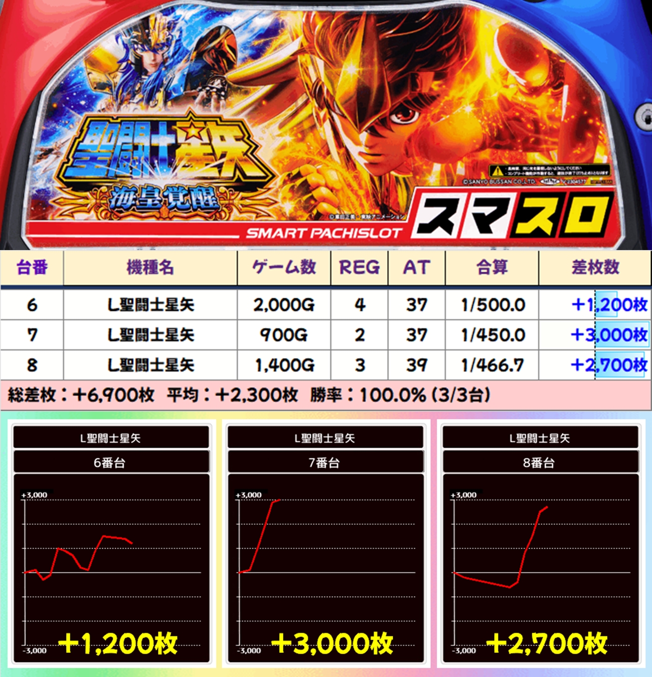 L聖闘士星矢に3台並びの仕掛けが出現。こちらの3台はいずれもプラスとなり、+3,000枚といった出玉も!
