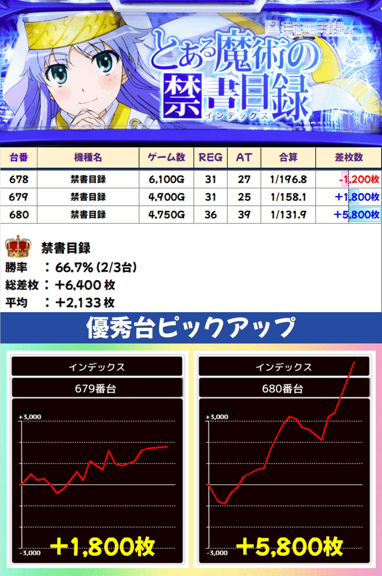 かぶぱポストにヒントがあった禁書目録は3台中2台がプラスの結果に。+5,800枚の優秀な出玉も確認できました!