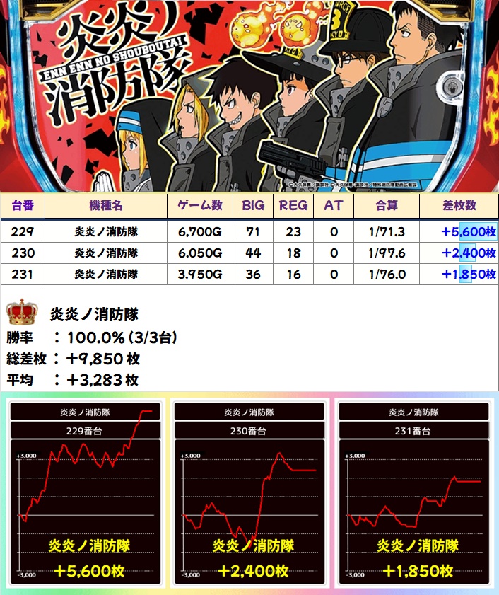 炎炎ノ消防隊からは全台プラス&平均+3283枚と好結果に!やはり第8消防隊という事で仕掛け対象になりやすいかも!?