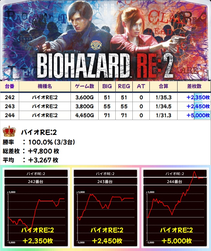 バイオRE2からも全台プラス&平均+3267枚の好結果に!29日はバイオの日だけに、こちらは思いっきり据え置きに期待しましょう!