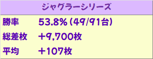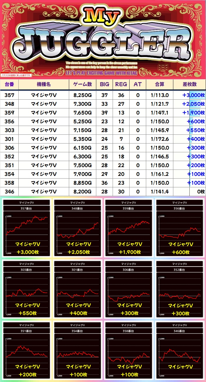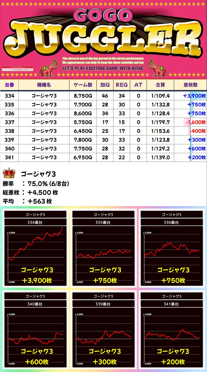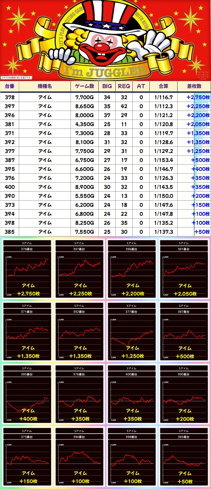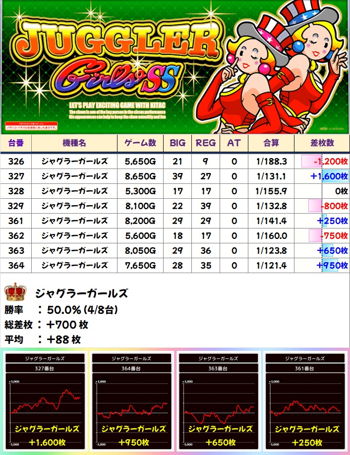 ジャグは全体で+107枚としっかりとプラスに! 今回も全機種から多数の優秀台が確認できました!