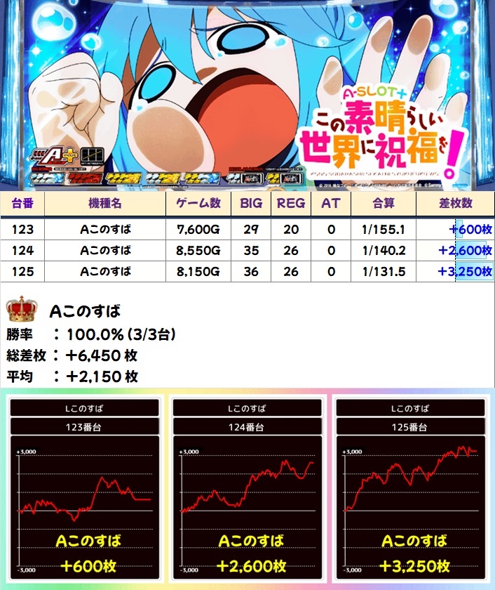 そして【ディスクアップ2】【Aこのすば】からも全台プラスの好結果に!どちらもしっかりと打ち込まれていたので、文句なしの全台系でしたね!