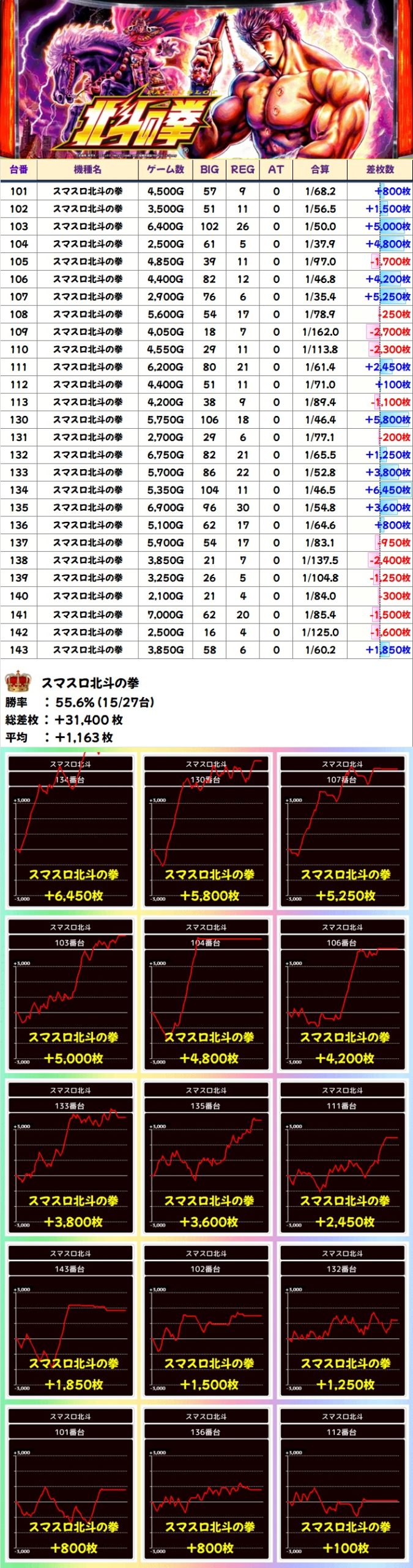 🌈スマスロ北斗の拳(27台)【平均+1163枚】