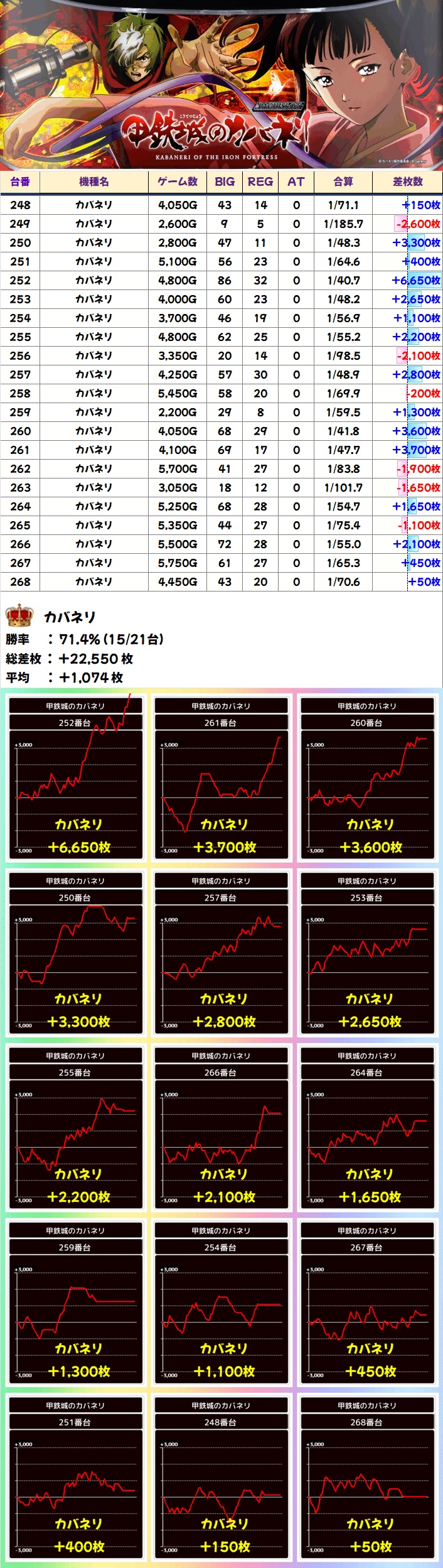 ピラミさん=大都機種にしっかりと多数の仕掛けがあったり、カエルシリーズからも仕掛け、そして看板機種の北斗&カバネリからは勝率ニブイチ以上&平均+1000枚越えの好結果に!