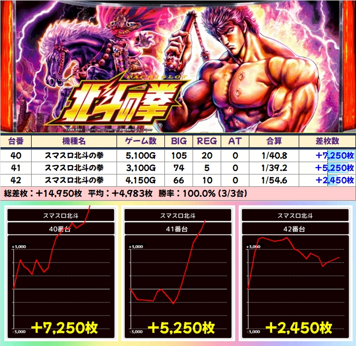 鉄板クラスに仕掛けのある「スマスロ北斗の拳」&「マイジャグV」など、3台以上の並びが7か所あり、ほぼ全箇所が平均+2000枚を大きく上回る好結果!