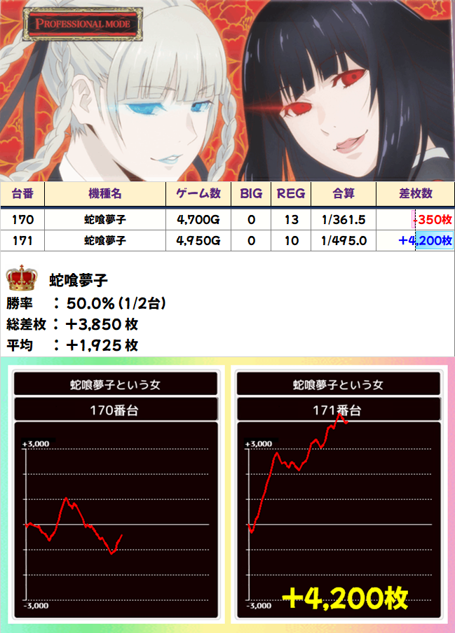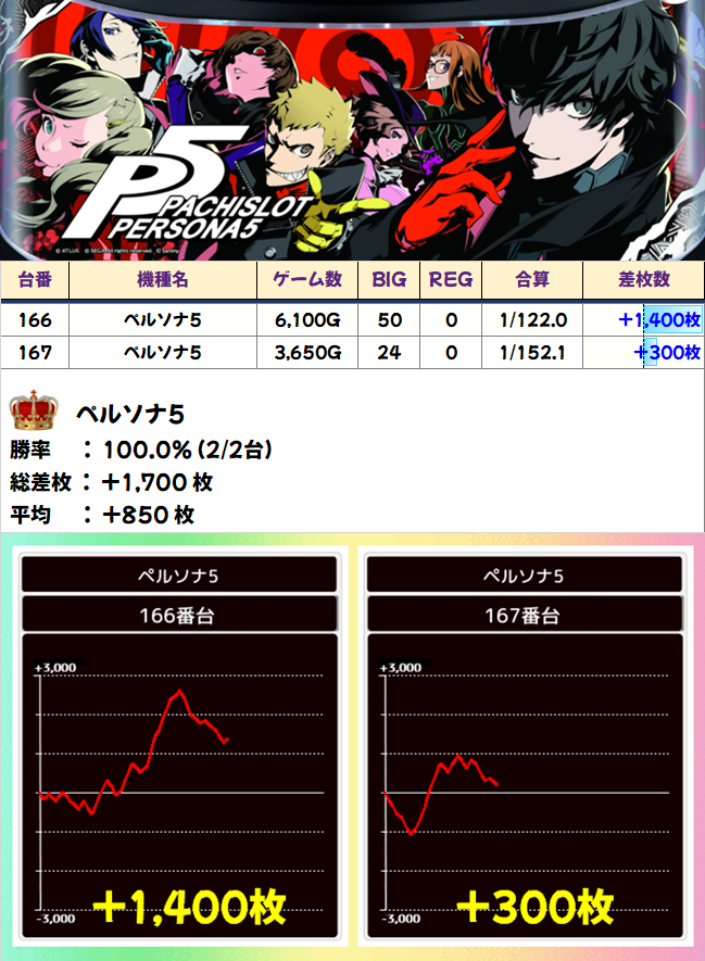 168~171番台の「ペルソナ5」「蛇喰夢子」が全台系となりました。4台中3台がプラス、「蛇喰夢子」から+4200枚もの出玉が飛び出しています!