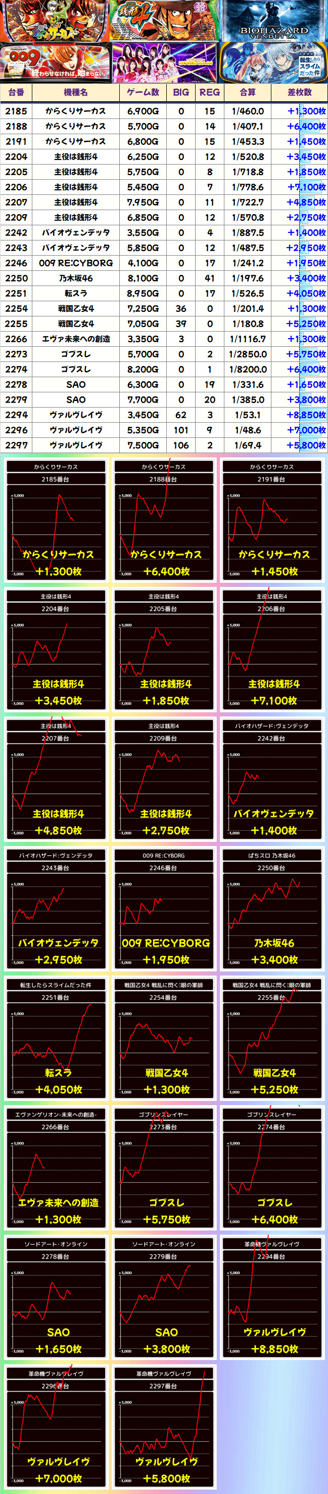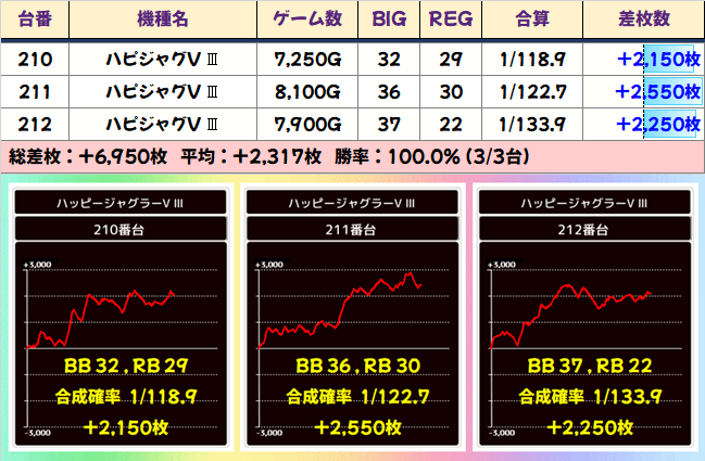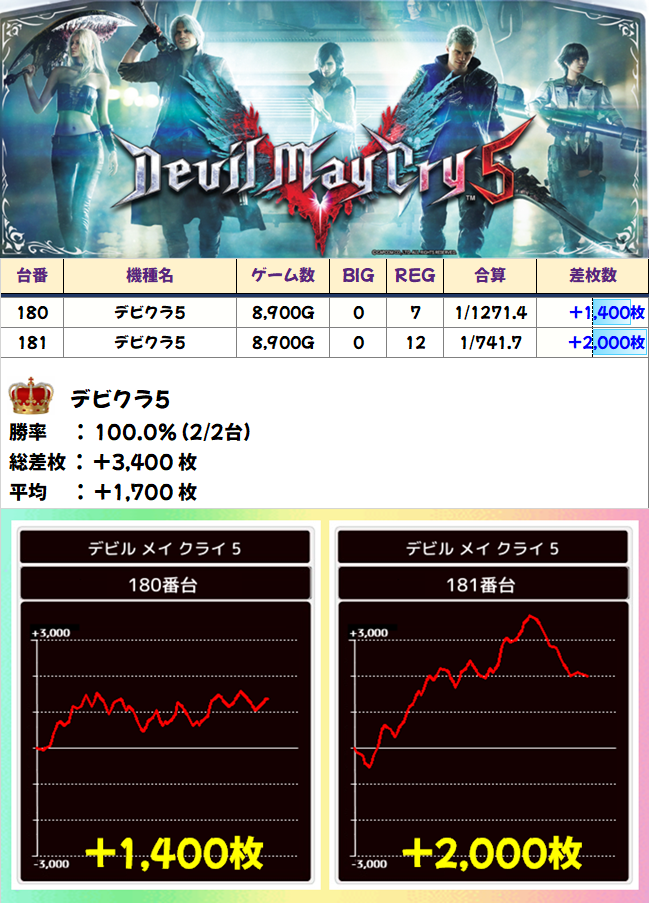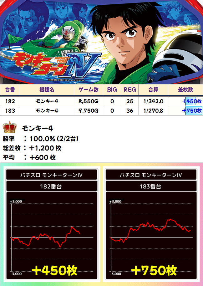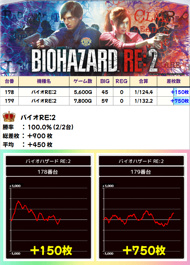 178~183番台の「バイオRE:2」「デビクラ5」「モンキー4」が全台系。どの台もブン回され、さすがの安定感で全台プラスと素晴らしい結果を残しました。
