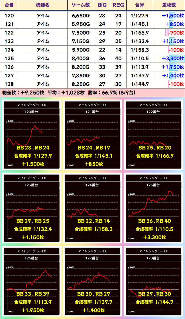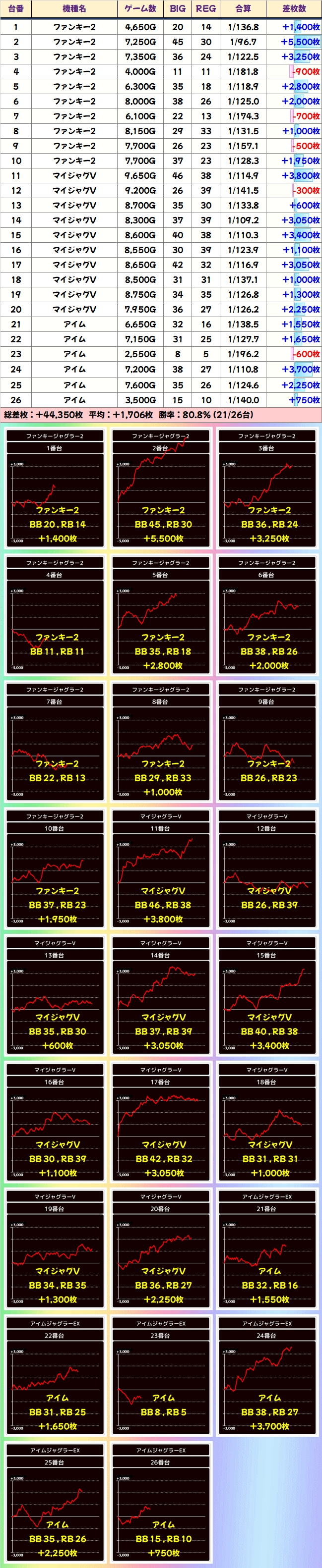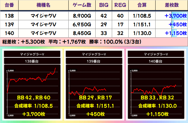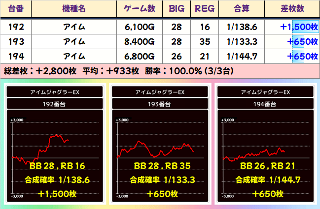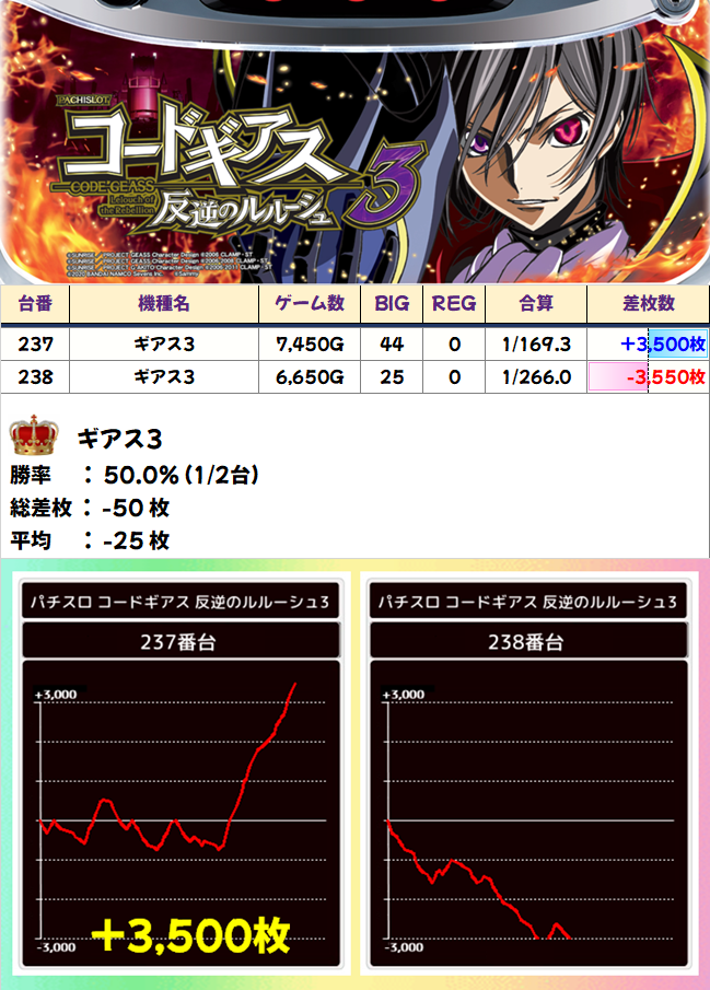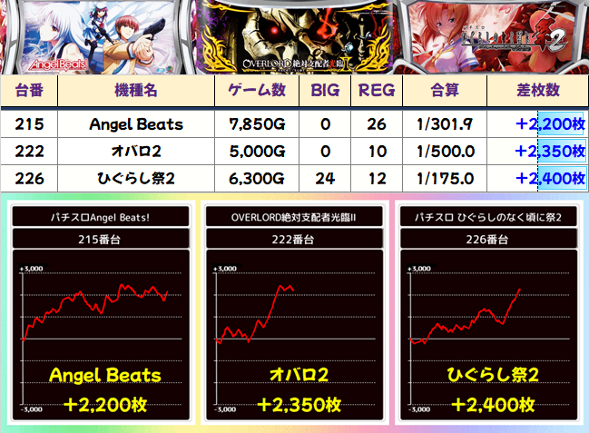 総差枚+207300枚、平均差枚+447枚と大盤振る舞い。全台系や並びの仕掛けが埋もれずに、しっかり結果を出してくれたことが分かりますね。